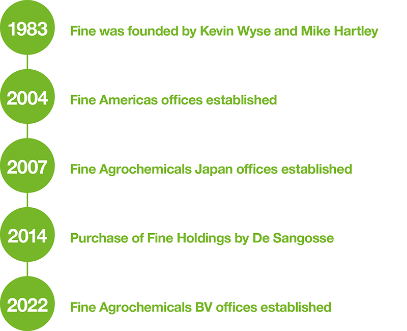 In July 2014, the Fine Holdings Group was purchased by De Sangosse, based in Agen, France. The De Sangosse Group develops, manufactures and markets products for global agricultural markets focusing on crop protection, plant nutrition and pest control. To continue our global expansion Fine has also established Fine Agrochemicals BV in the Netherlands which took place in 2022. This latest development in the Fine Group’s 40+ year history further consolidates Fine’s position as a global leader in PGRs.
